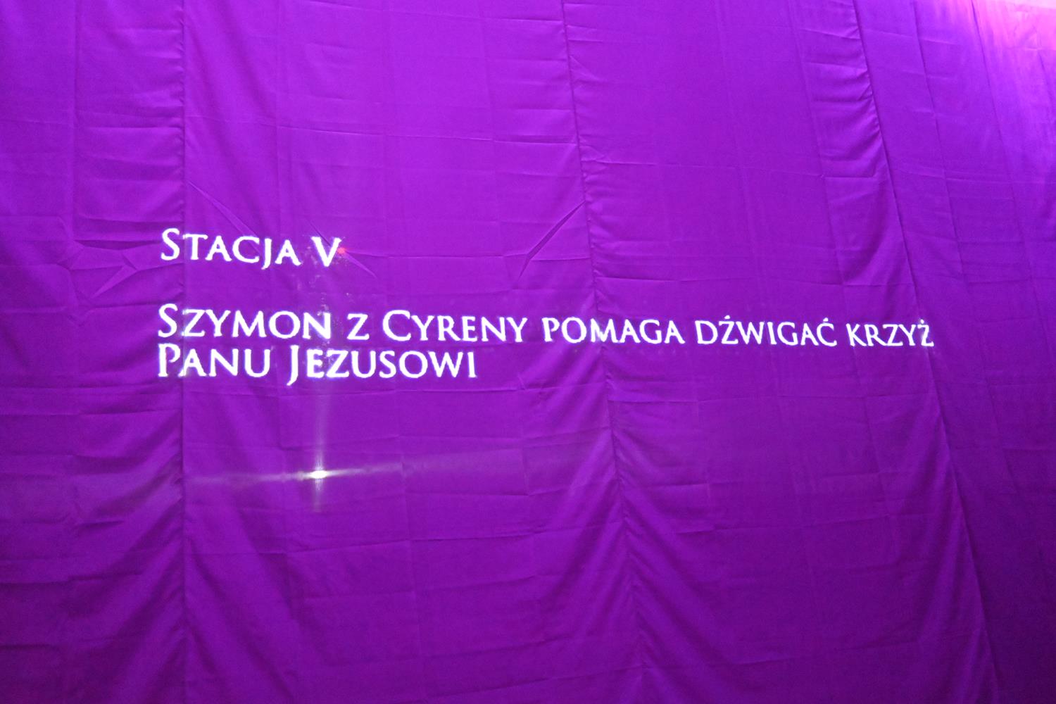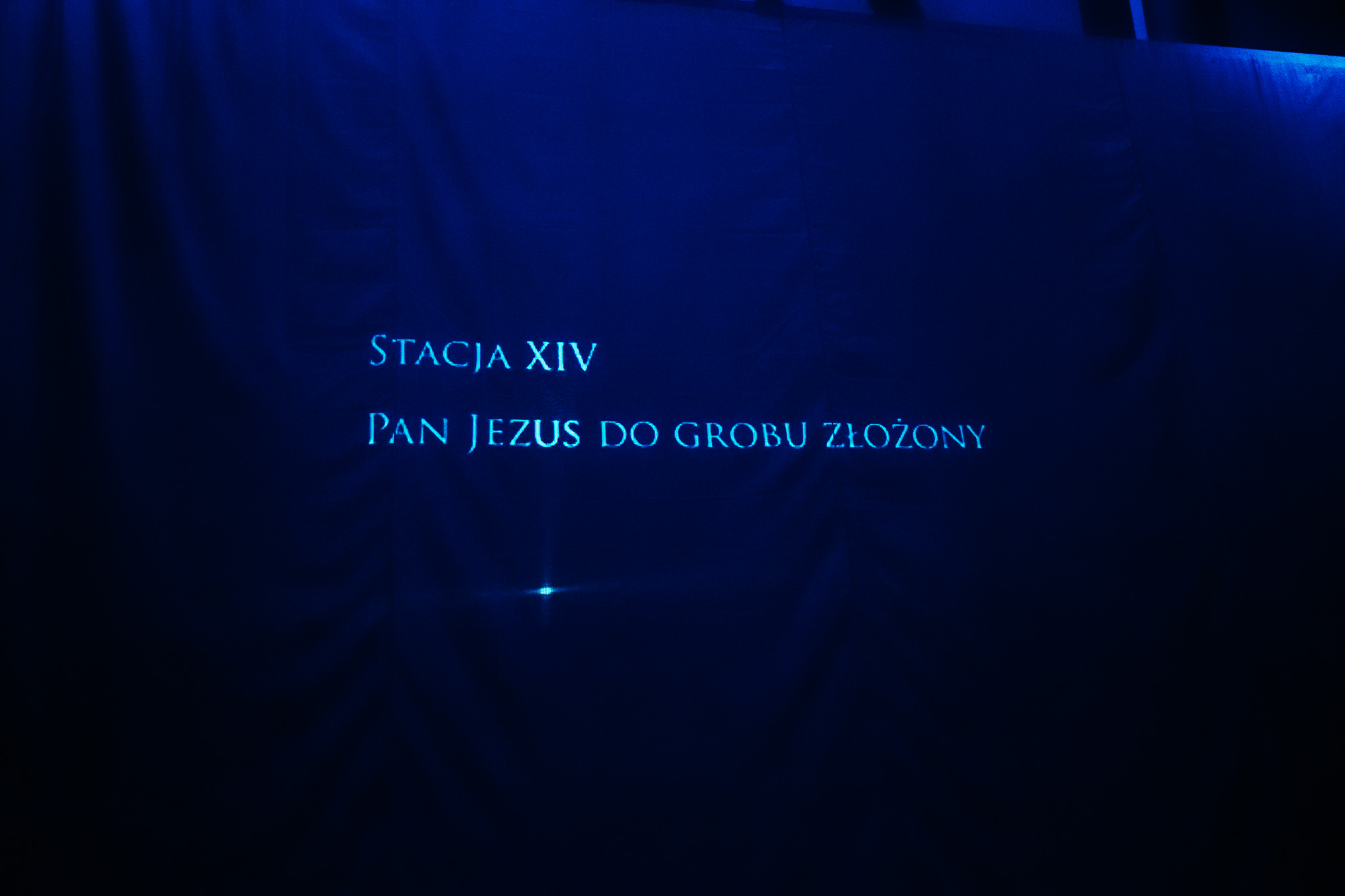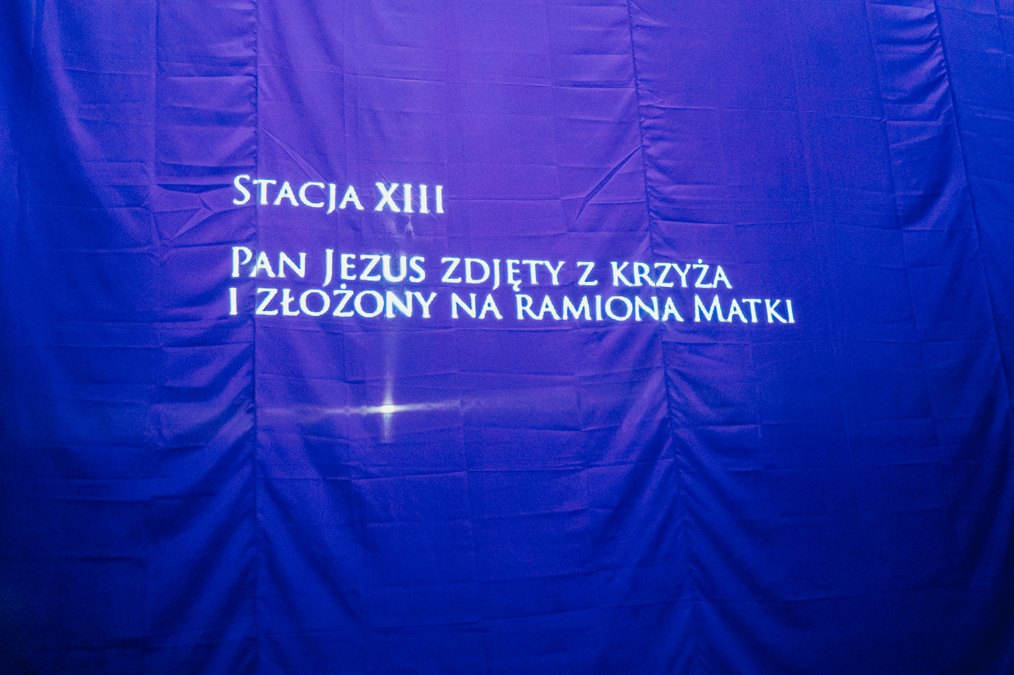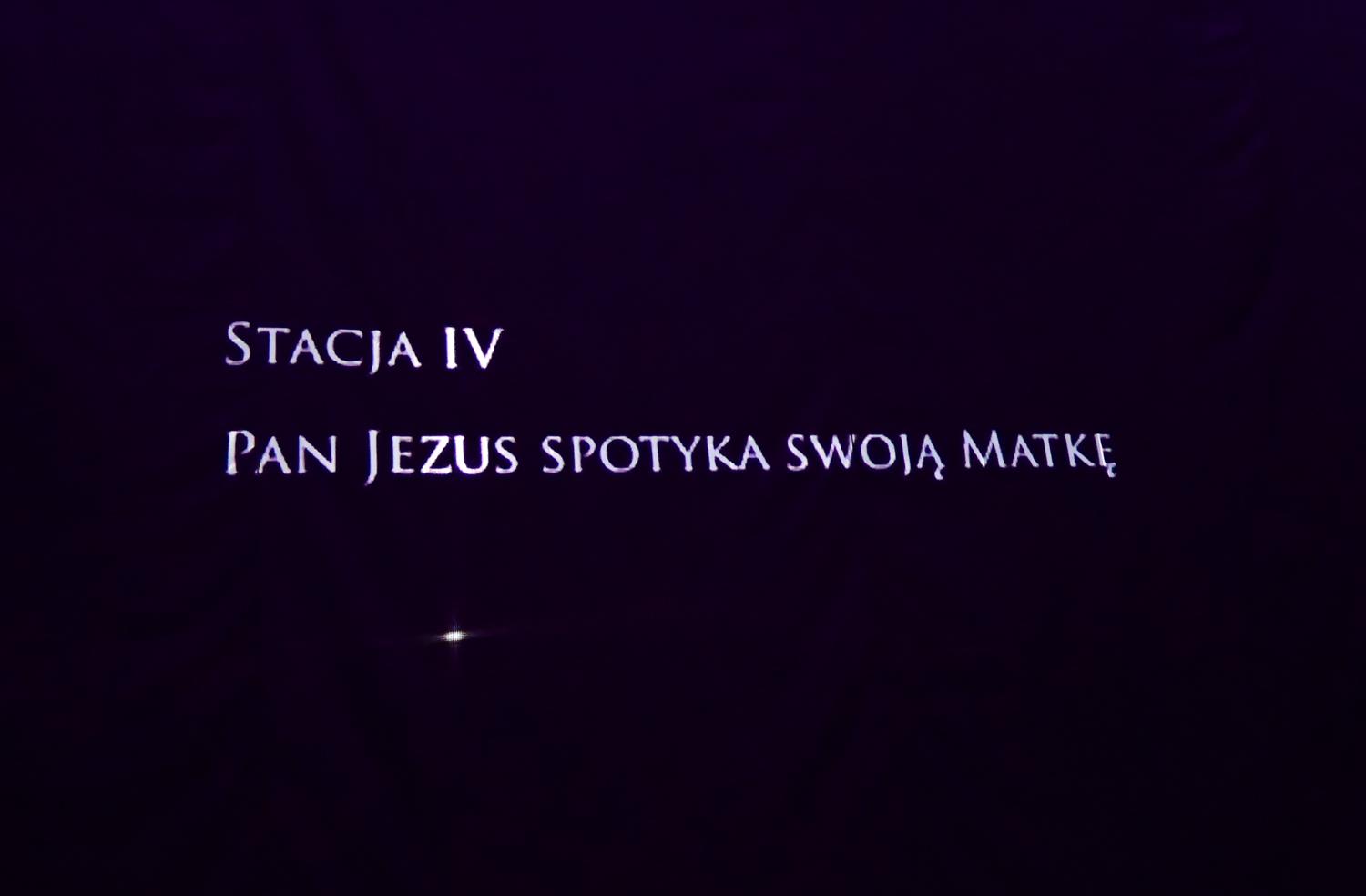 Każdej z czternastu stacji towarzyszył fragment filmu „Pasja” w reżyserii Mela Gibsona, którego realistyczne i poruszające sceny cierpienia Jezusa stanowiły tło dla dalszych rozważań. Po każdej projekcji zza kotary wyłaniała się postać – uosobienie konkretnej emocji. Prowadząca pytała ją: „Kim jesteś?”, a odpowiedź wprowadzała wiernych w głębię danej stacji.