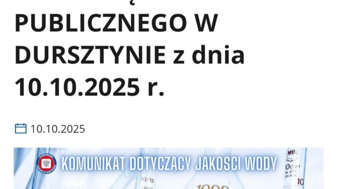 Komunikat dotyczący jakości wody z wodociągu w Dursztynie 10 października 2025 Krystyna Waniczek Na bieżąco 0 1