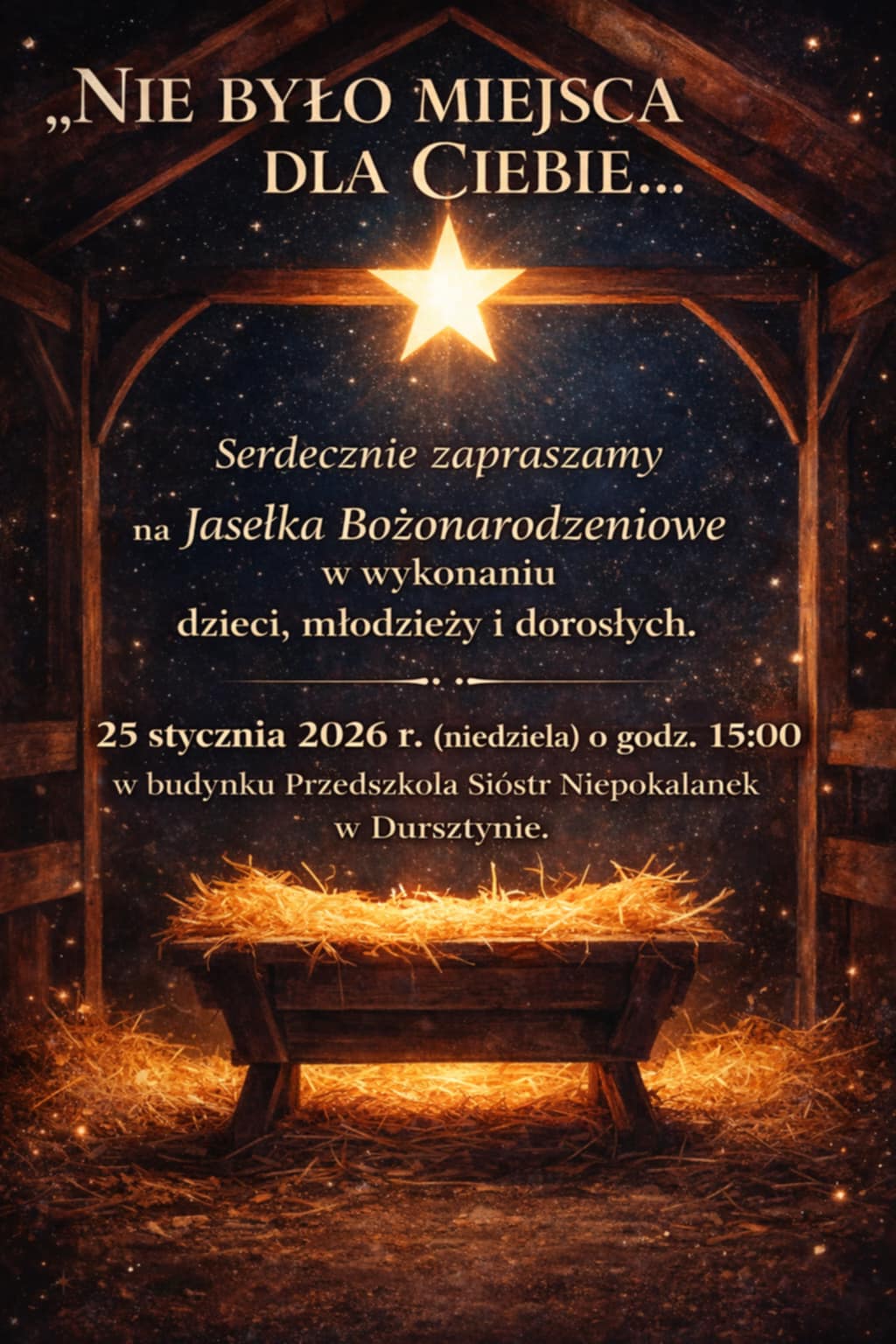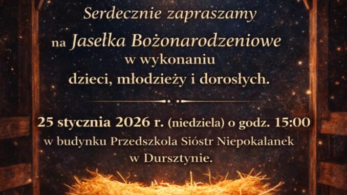 “Nie było miejsca dla Ciebie…” 18 stycznia 2026 Krystyna Waniczek Przedszkole, Przedszkole, Siostry Niepokalanki, Siostry Niepokalanki 0 Serdecznie zapraszamy na Jasełka Bożonarodzeniowe w wykonaniu dzieci, młodzieży i dorosłych. Przedstawienie odbędzie się 25 stycznia (niedziela) o godz. 15.00 w budynku Przedszkola Sióstr Niepokalanek w Dursztynie. Tego nie można przegapić! 1