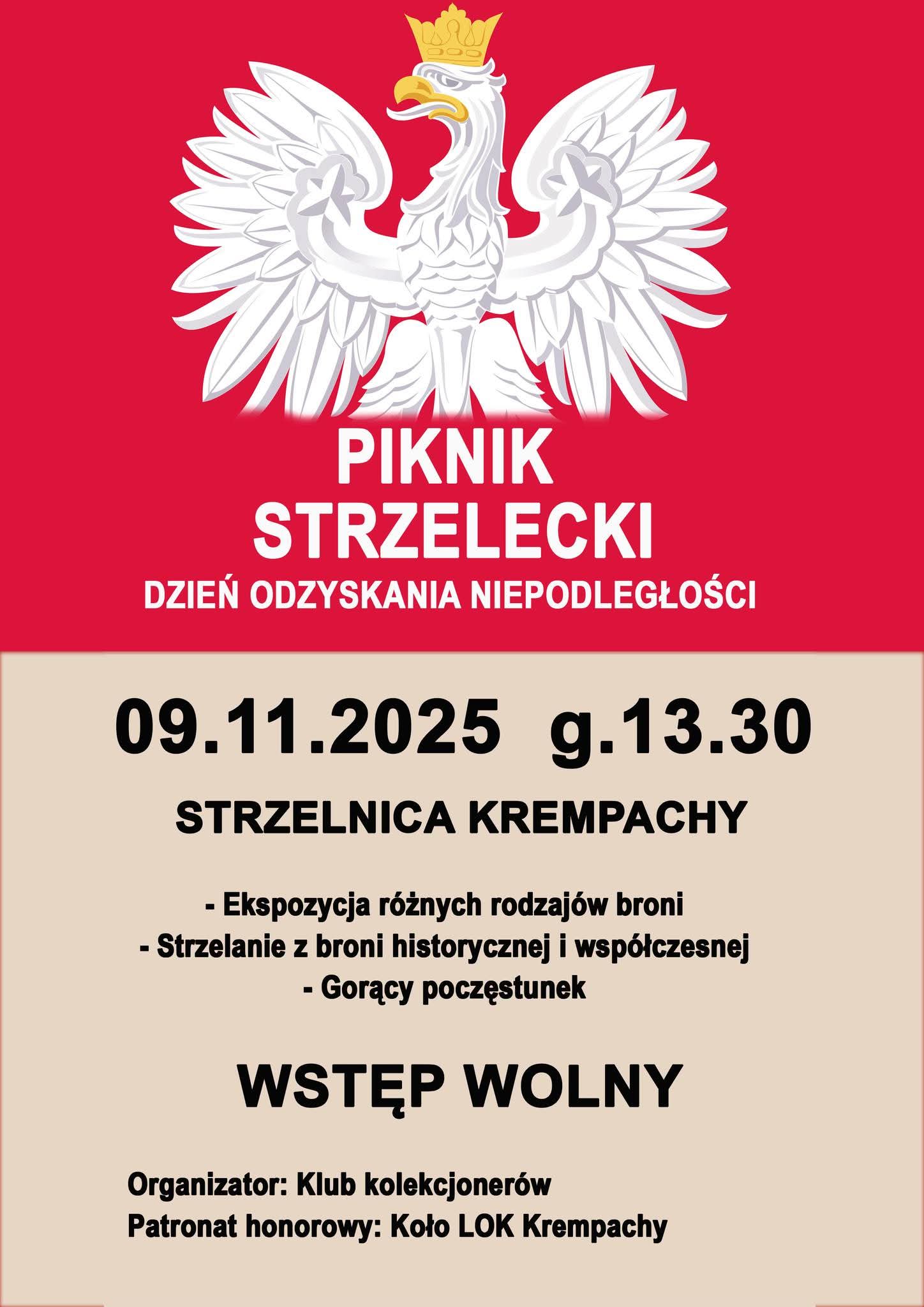 Zarząd Strzelnicy w Krempachach serdecznie zaprasza wszystkich miłośników historii, sportu i dobrej zabawy na Piknik Strzelecki z okazji Dnia Niepodległości, który odbędzie się w niedzielę 9 listopada o godz. 13.30