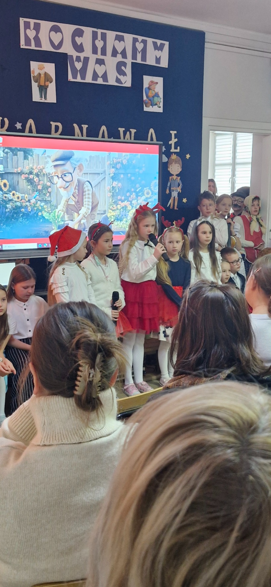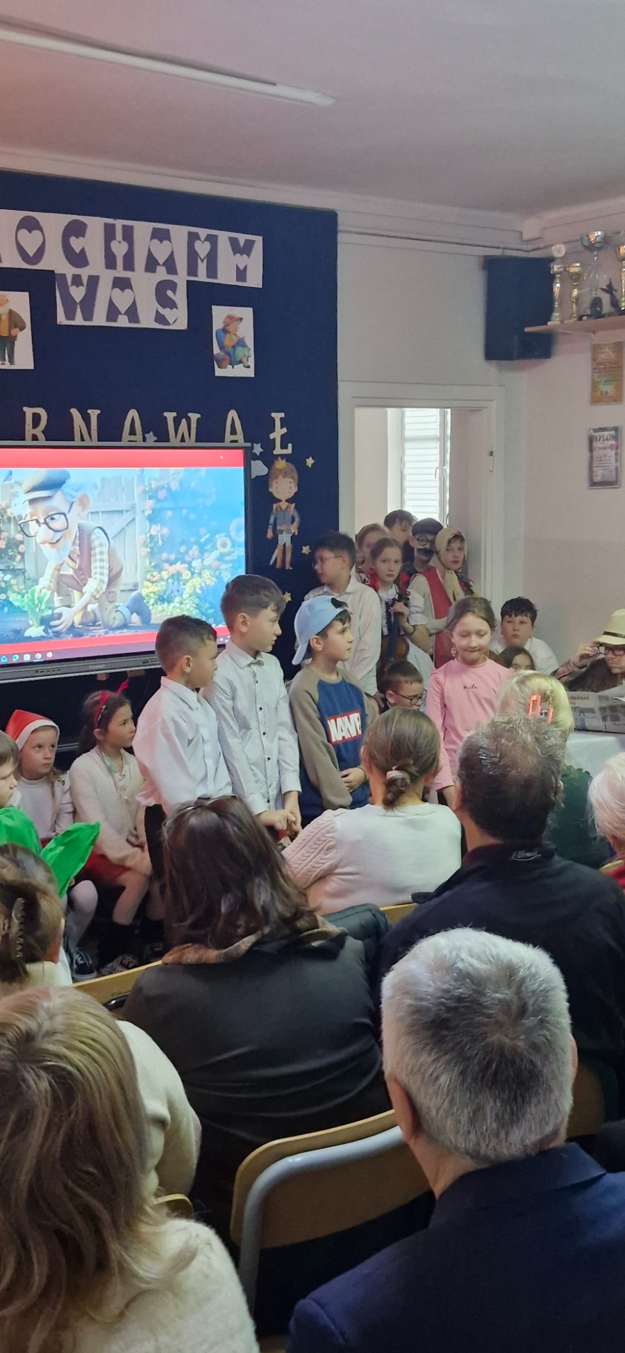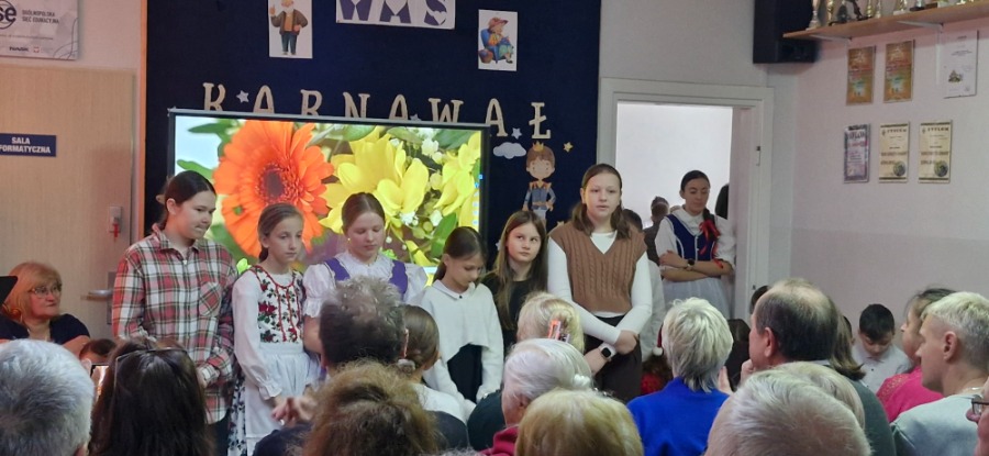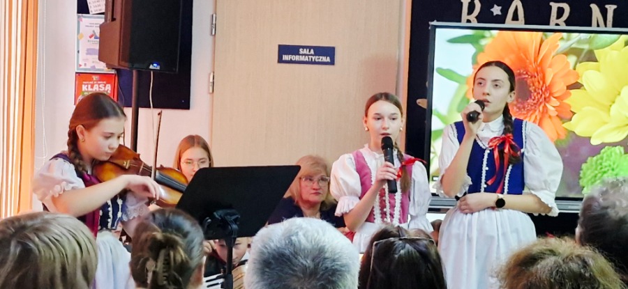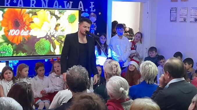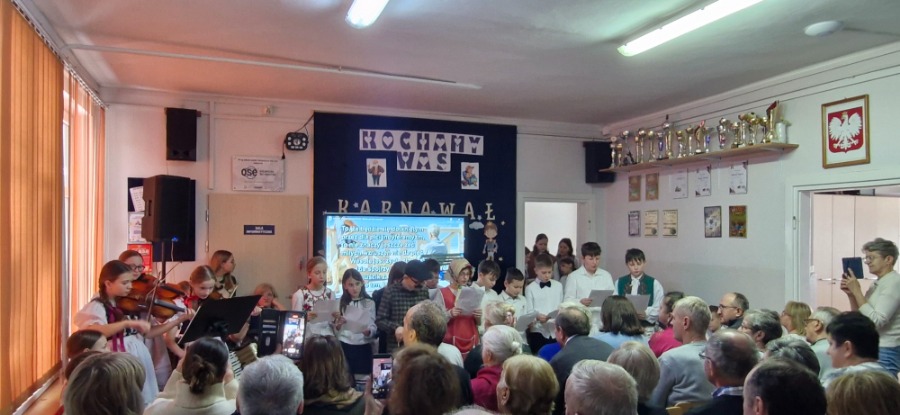 W dalszej części programu na scenie pojawili się uczniowie klas IV-VIII. Starsza młodzież zadbała o nastrojową oprawę wydarzenia, prezentując tradycyjne kolędy. Wspólne granie na instrumentach i śpiew stworzyły podniosłą, a jednocześnie bardzo ciepłą atmosferę, która udzieliła się wszystkim zgromadzonym. Prawdziwym zwieńczeniem akademii był popisowy występ Piotra Szewczyka, którego talent i charyzma stały się muzyczną kropką nad „i” całego spotkania.