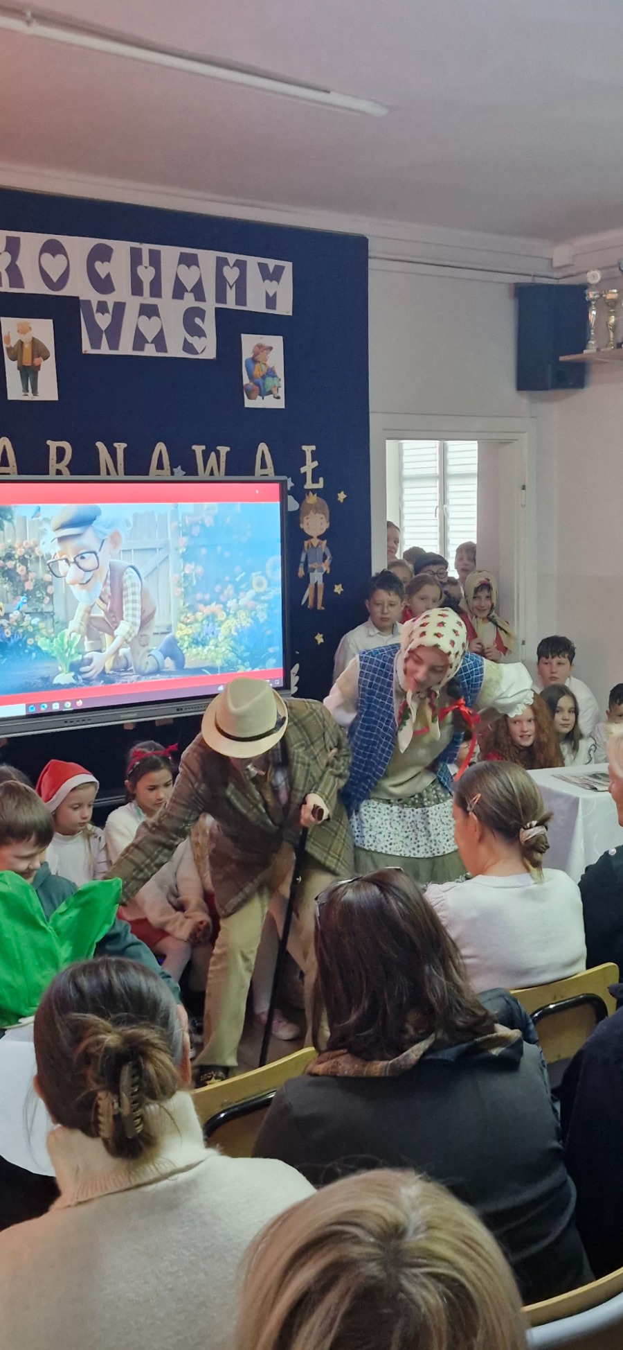 Uroczystość rozpoczęła się od części artystycznej, którą zainaugurowali uczniowie klas I-III. Najmłodsi zaprezentowali pełną humoru i werwy inscenizację popularnego utworu „Rzepka”, a dopełnieniem ich występu były wzruszające piosenki, które wnukowie z wielkim zaangażowaniem wyśpiewali swoim bliskim.
